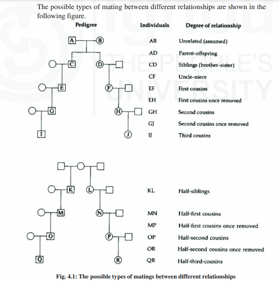 Generally, the coefficient of inbreeding (F) is half of the coefficient of relationship (r). For example, the coefficient of relationship of incestuous relationship (such as in between father-daughter, mother-son, or brother-sister) shares half of their genetic materials (r=0.5). Therefore, any siblings of such incestuous parents would be homozygous at 1/4 of gene loci (F=0.25). In the case of uncle-niece marriage, both the parents share 1/4 of their genetic components, and hence, the coefficient of relationship (r) is 0.25. On the other hand, the coefficient of inbreeding in their progeny will be half of the coefficient of relationship (r) i.e., F=0.125. Measure of relationship of individuals in terms of consanguinity that is coefficient of relationship and coefficient of inbreeding of different levels of degrees are shown in table 10.1