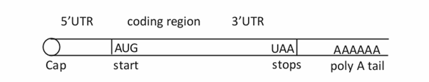 It’s this RNA, which carries the message present in the gene to the cytoplasm where synthesis of protein occurs. Only the central part of the mRNA is translated. The region of the first exon and the last exon which are not translated are denoted as 5’UTR and 3’UTR. Each group of three mRNA bases constitutes a codon which specifies an amino acid. The length of different mRNAs vary considerably basing on the length of the gene.