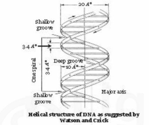 The bases are stacked on one another 3.4Ao apart and are perpendicular to the axis of the double helix. The diameter of the helix is about 20Ao and each complete turn of helix measures 34Ao, thus accommodating 10 base pairs in each turn.