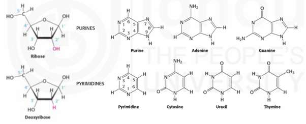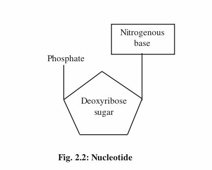 The sugar is a pentose sugar which is deoxyribose in DNA because it lacks Oxygen at second Carbon position. To distinguish between the Carbon atoms present in the base and sugar, the Carbon atoms in the sugar are given a prime (‘). The bases attach to the sugar (at 1’C) by glycosidic bond.
