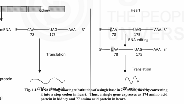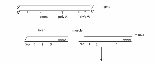 We’ve already discussed about alternative splicing due to which we are getting about 2,00,000 proteins from the 25,000 genes we have. In simple terms, alternative splicing means getting more number of mRNAs from a single gene. This is possible by differential splicing in different tissues. For eg. a sequence which acts as an intron in one tissue may act as a coding sequence in another tissue thereby changing the sequence of the polypeptide in different tissues.